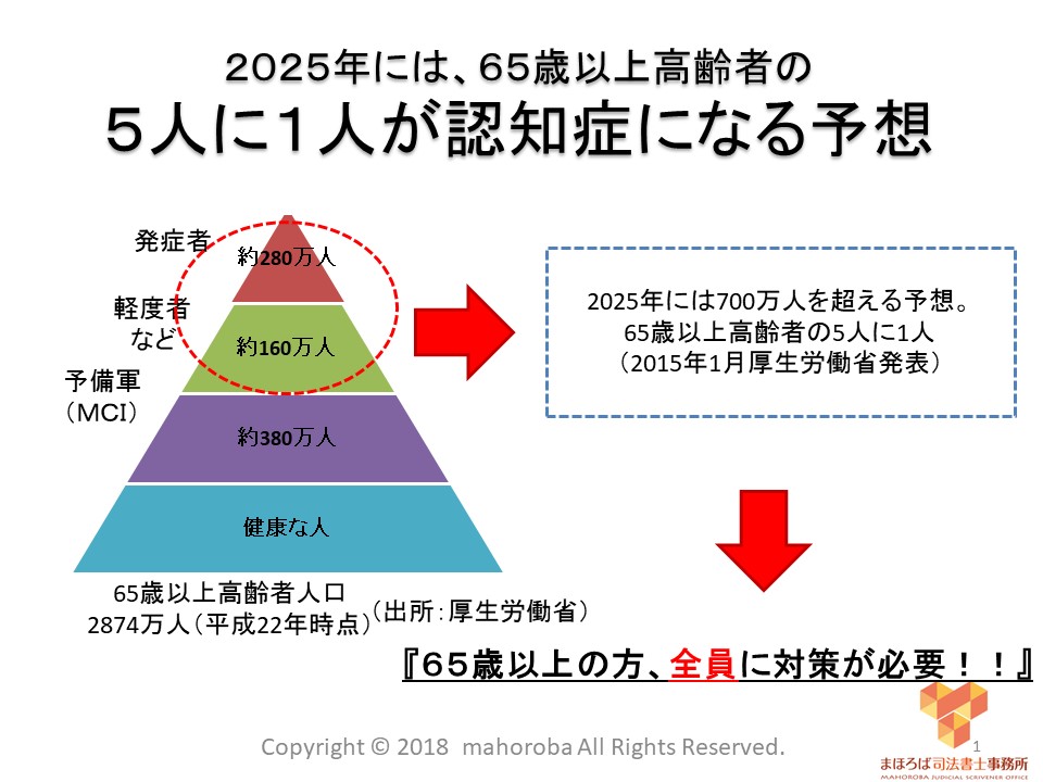厚労省の発表によると2025年には65歳以上高齢者の5人に1人が認知症になる予想が出ています。認知症が悪化すると預貯金をはじめ財産が凍結になります。これは介護資金の問題に直結します。